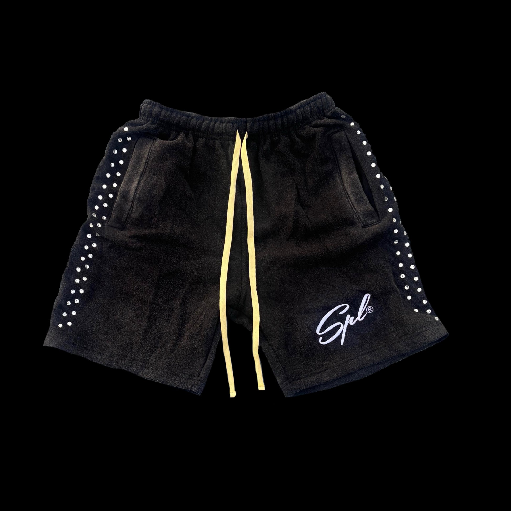 Crafted from 100% cotton for comfort and breathability. Designed with white rhinestones down the sides and a bold embroidered SPL® logo on the left leg.